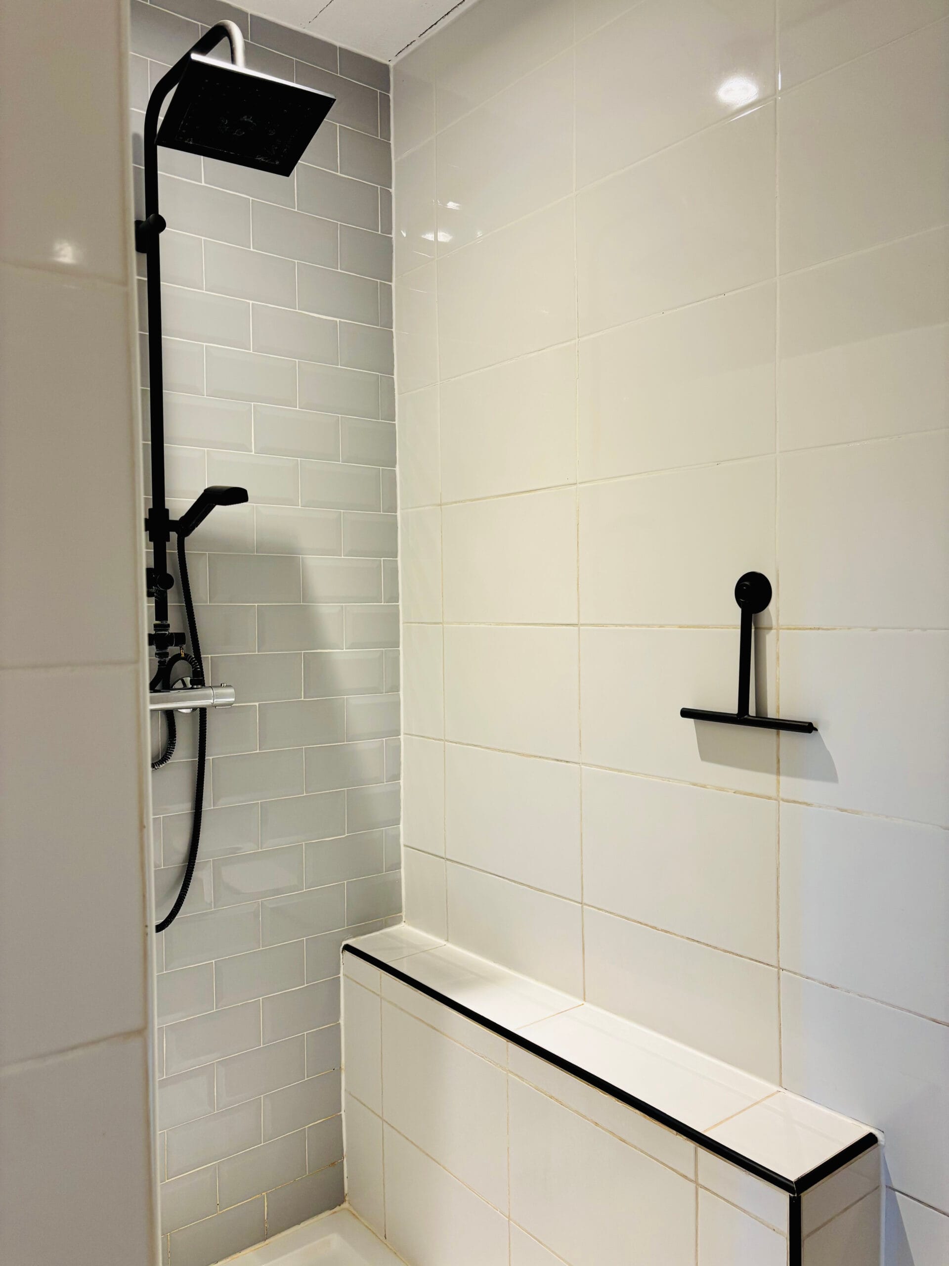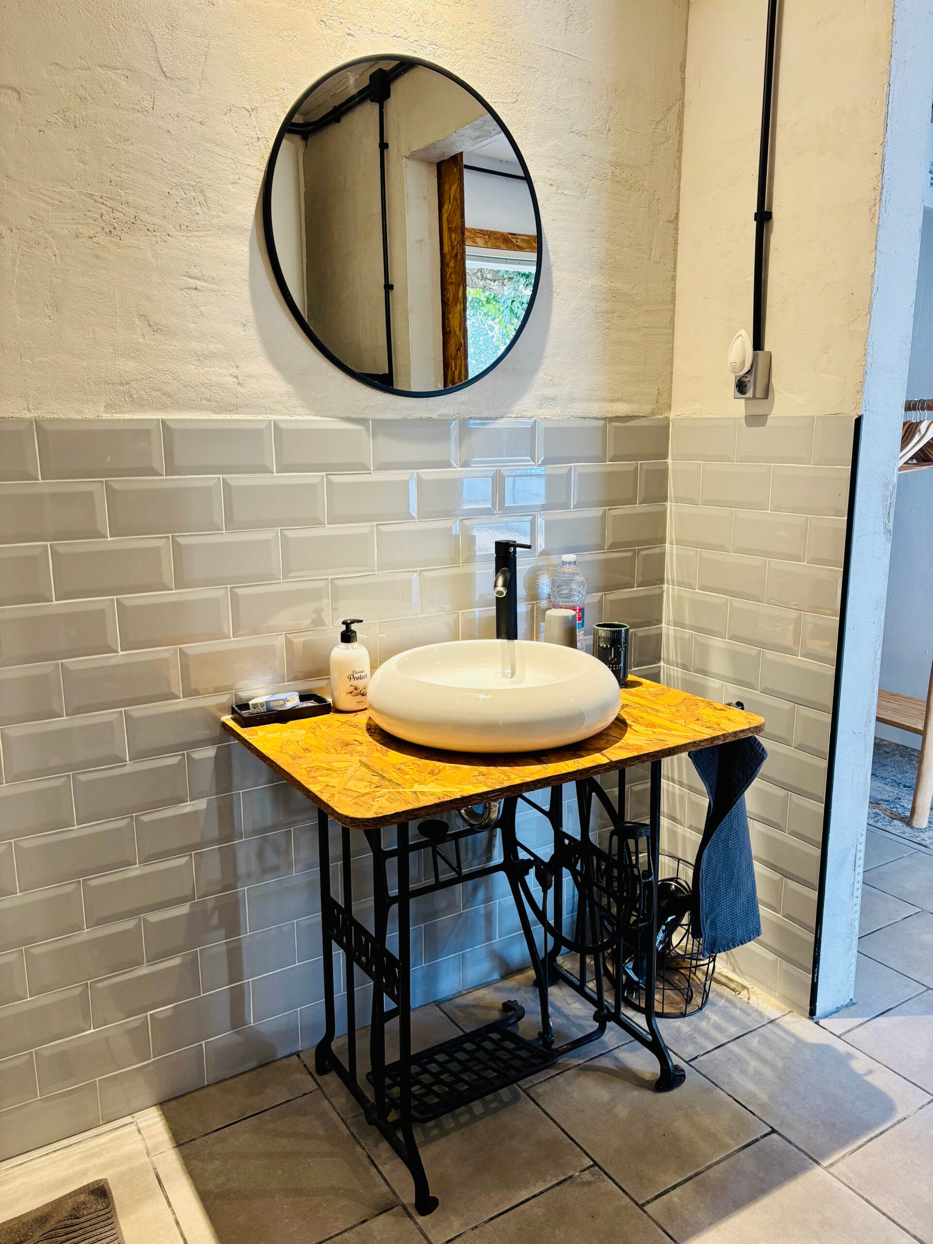 Suite Gris beschikt over een privé badkamer, die bereikbaar is via een kleine hal. De badkamer heeft een inloopdouche, wastafel met spiegel, toilet en föhn.